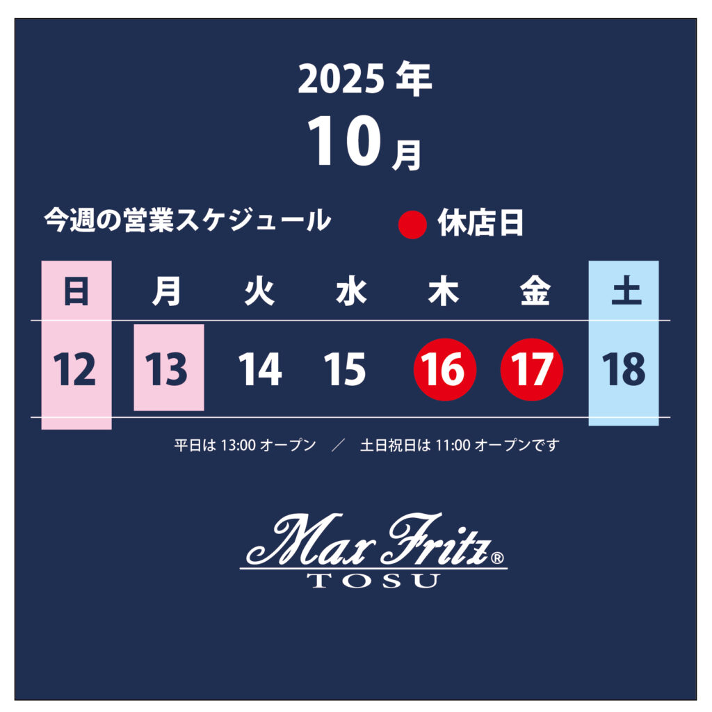 今週は木曜日と金曜日がお休みとなります。よろしくお願いいたします。 平日は13:00オープンとさせていただいておりますが、土日祝日は今まで通り11:00オープンです お知らせ この記事が気に入ったら いいね または フォローしてね! Follow @MaxFritz_tosu Follow Me 気に入ったらシェアお願いいたします! URLをコピーしました! URLをコピーしました! LROCCO bootsさん到着〜 【冬用ジャケット】ブロックチェックダブルライダース