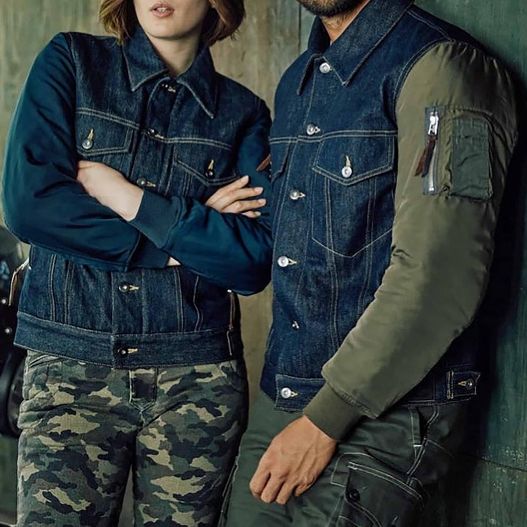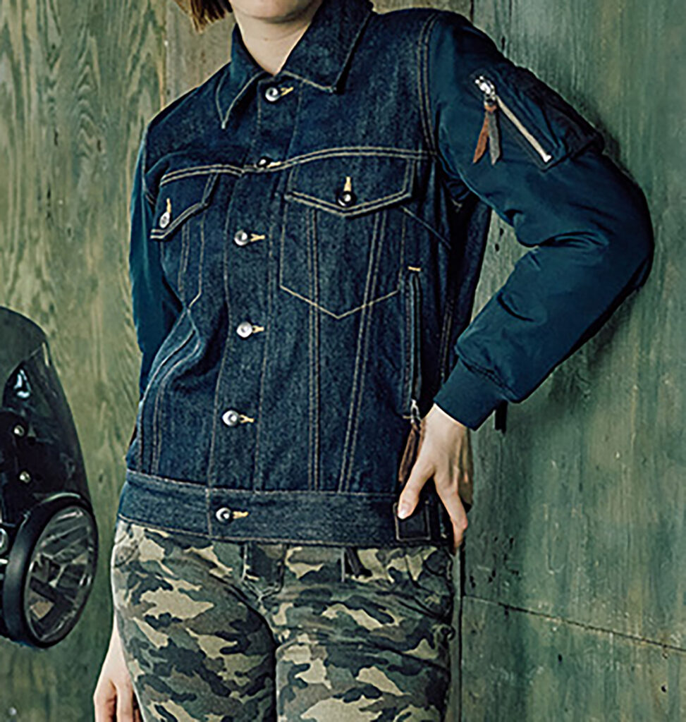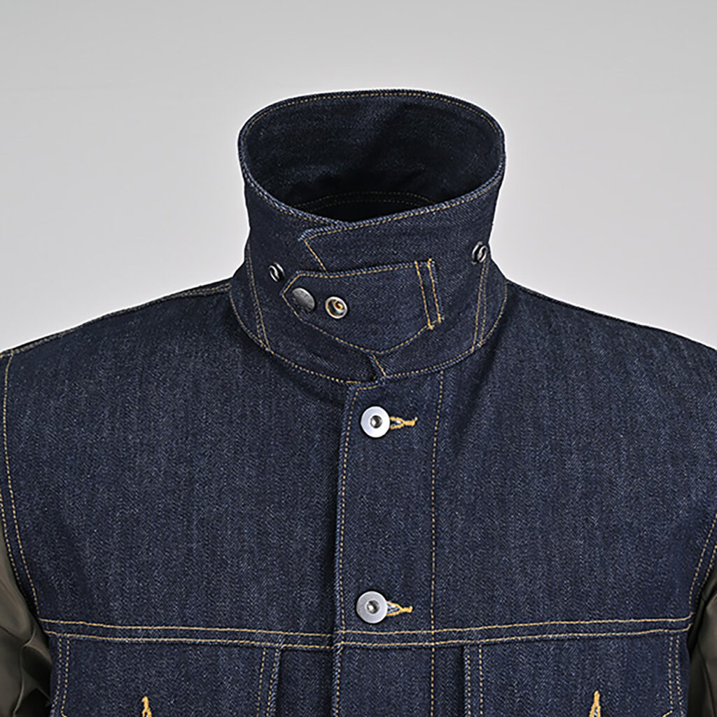 ”ジージャン”そのまんまだとフロントの防風性能が問題ですのでボタンに加えてファスナーも装備しています。
