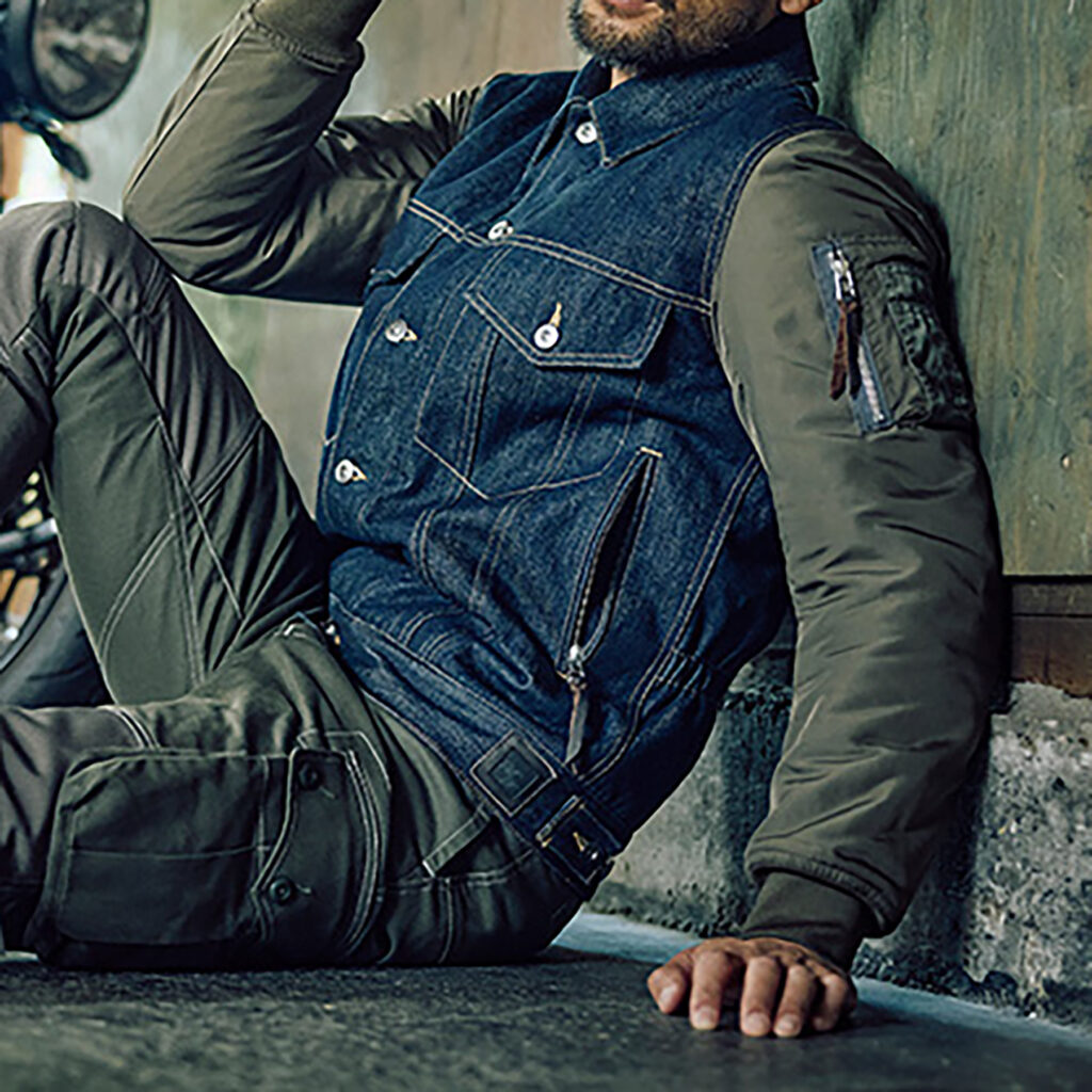 アメカジ定番のデニムジャケットとフライトジャケットをドッキングさせた冬用ジャケット。 身頃はデニム生地、袖はポリエステル。裏地は滑りやすいポリエステルのひょうた...