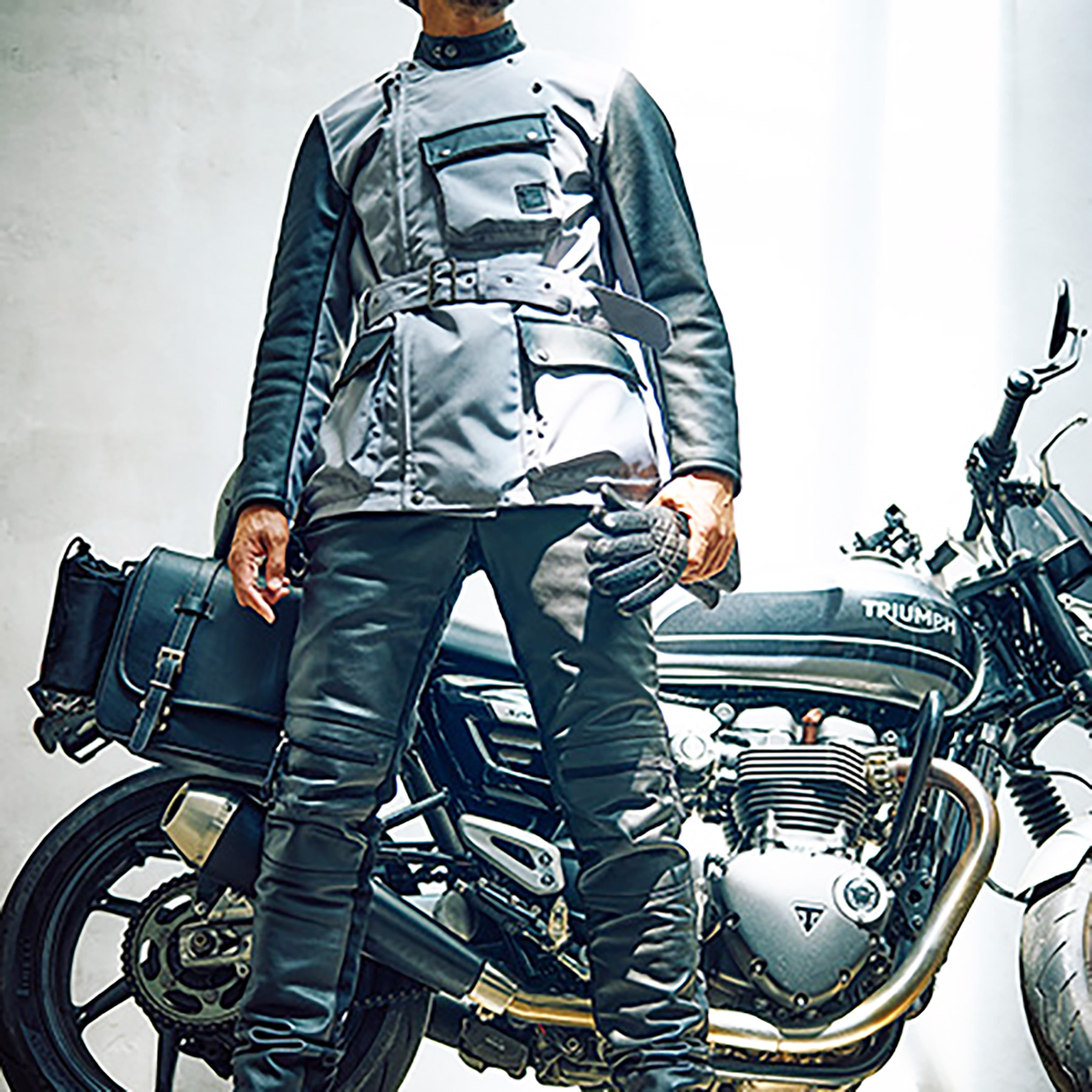 身頃に耐摩耗性・撥水性・柔軟性に優れたポリエステルTPUコーティングされた高機能生地。