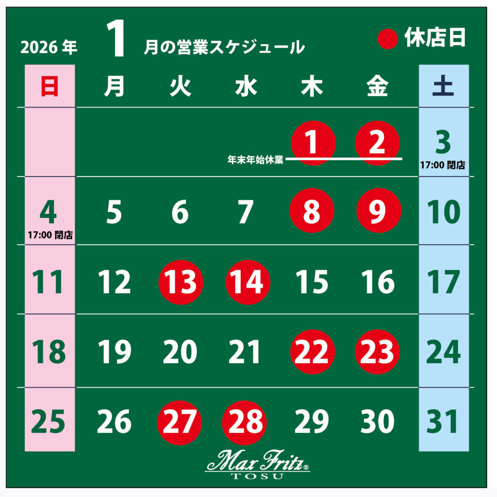 平日は13:00オープンとなります※土日、祝日は11:00オープンです。 2026年1月の営業スケジュールです。 お知らせ この記事が気に入ったら いいね または フォローしてね! Follow @MaxFritz_tosu Follow Me 気に入ったらシェアお願いいたします! URLをコピーしました! URLをコピーしました! 年末年始の営業スケジュール