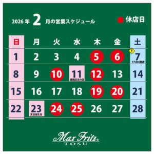 建国記念の日が休店日と重なりますので1日ずらして12日がお休みとなります。