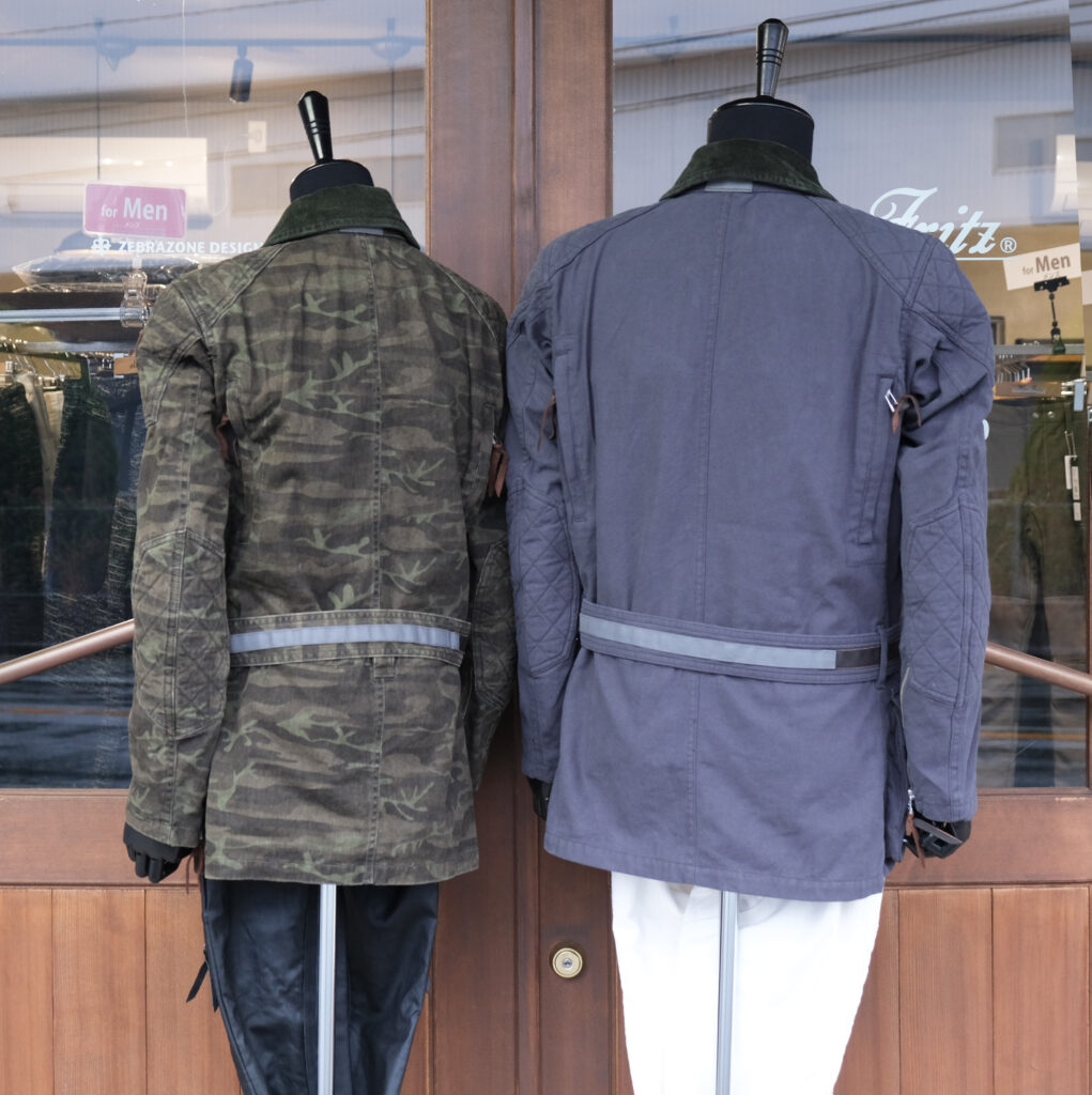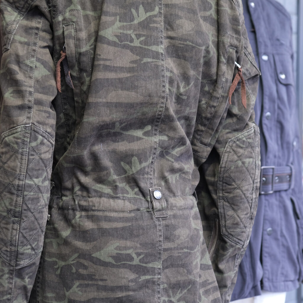 上の画像ではカモフラがベルト無し、チャコールの方はスタンドカラー状態にしております。