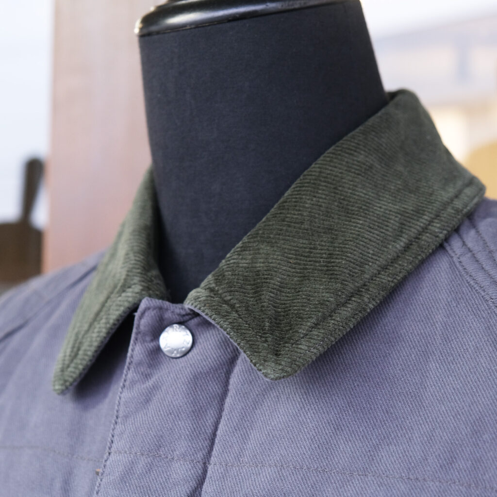 襟はコーデュロイを用いており、スタンドカラーとして使う場合の肌あたりの良さにも配慮。