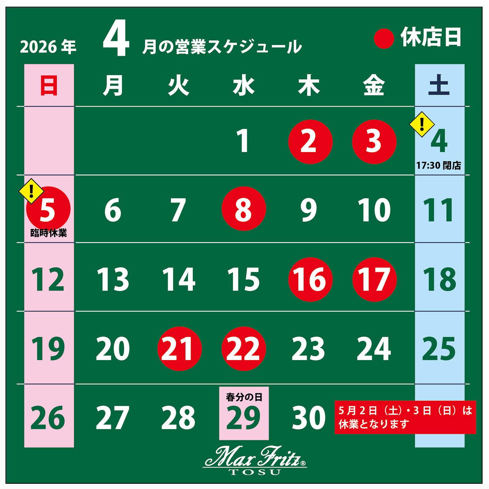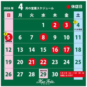 4月が終わるとゴールデンウィーク入りますが、今年は5月2日(土)/3日(日)の2日間お休みをいただきます