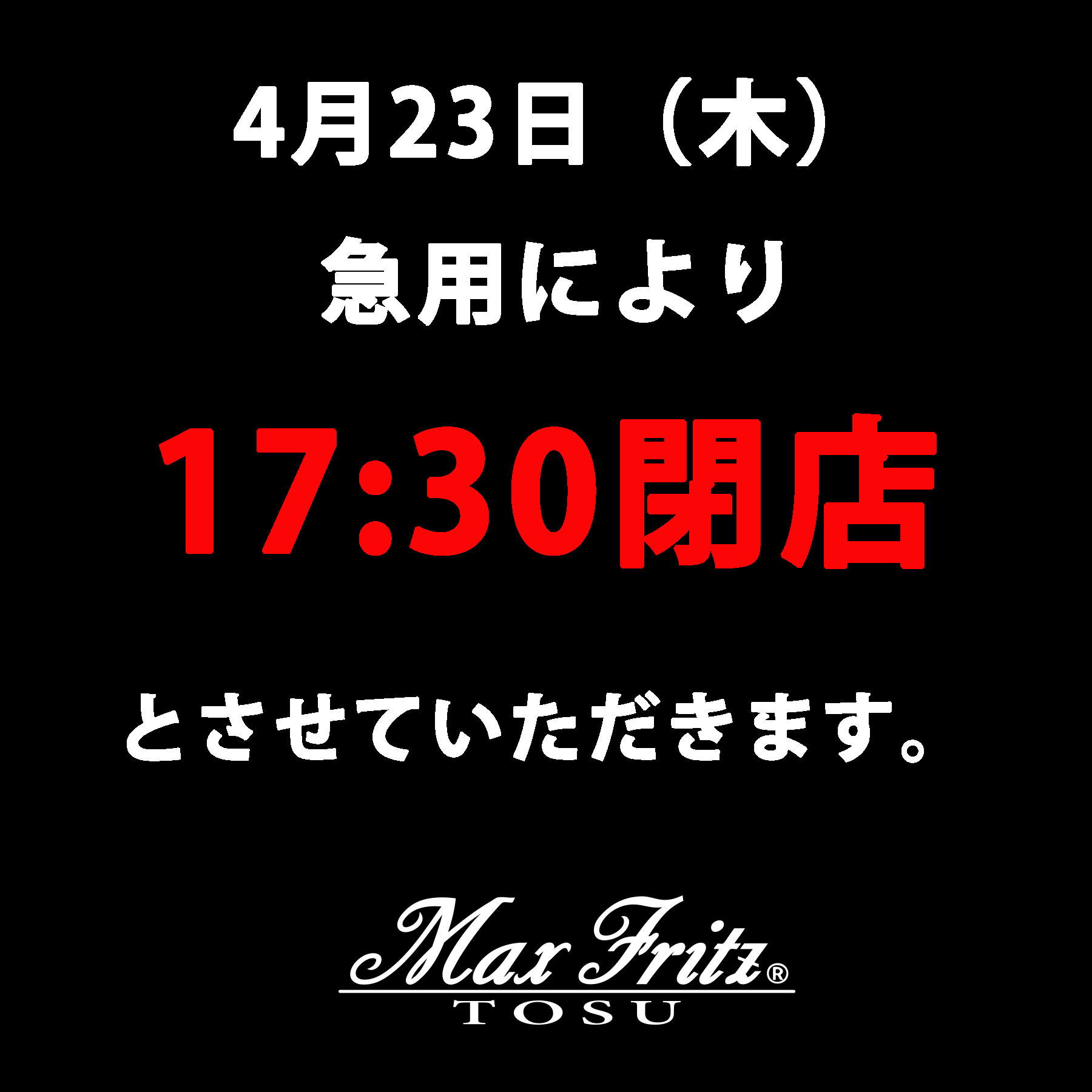 本日(4月23日)は17:30に閉店させていただきます。