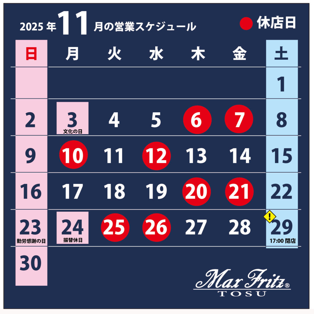 平日は13:00オープンとなります※土日、祝日は11:00オープンです。 11月の営業スケジュールです。いきなり冬になってしまいましたが皆様お元気でしょうか?2025年も残すところあと2ヶ月となりましたが、元気に参りましょう。 今月はいつもの可変式ですが、1... -