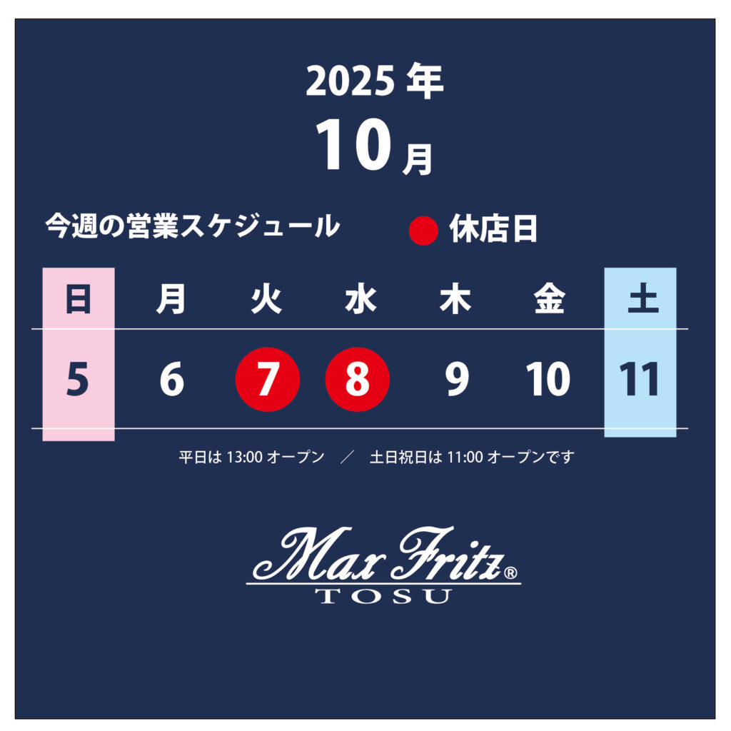 マックスフリッツ鳥栖半年に一度の恒例イベントなっております、神戸のブーツ職人Lrocco boots(ロッコ・ブーツ)さんをお招きしてのオーダー会を今年も開催いたします。 2025年10月11日(土)/12日(日)/13日(祝)の三日間、マックスフリッツ鳥栖店頭... -